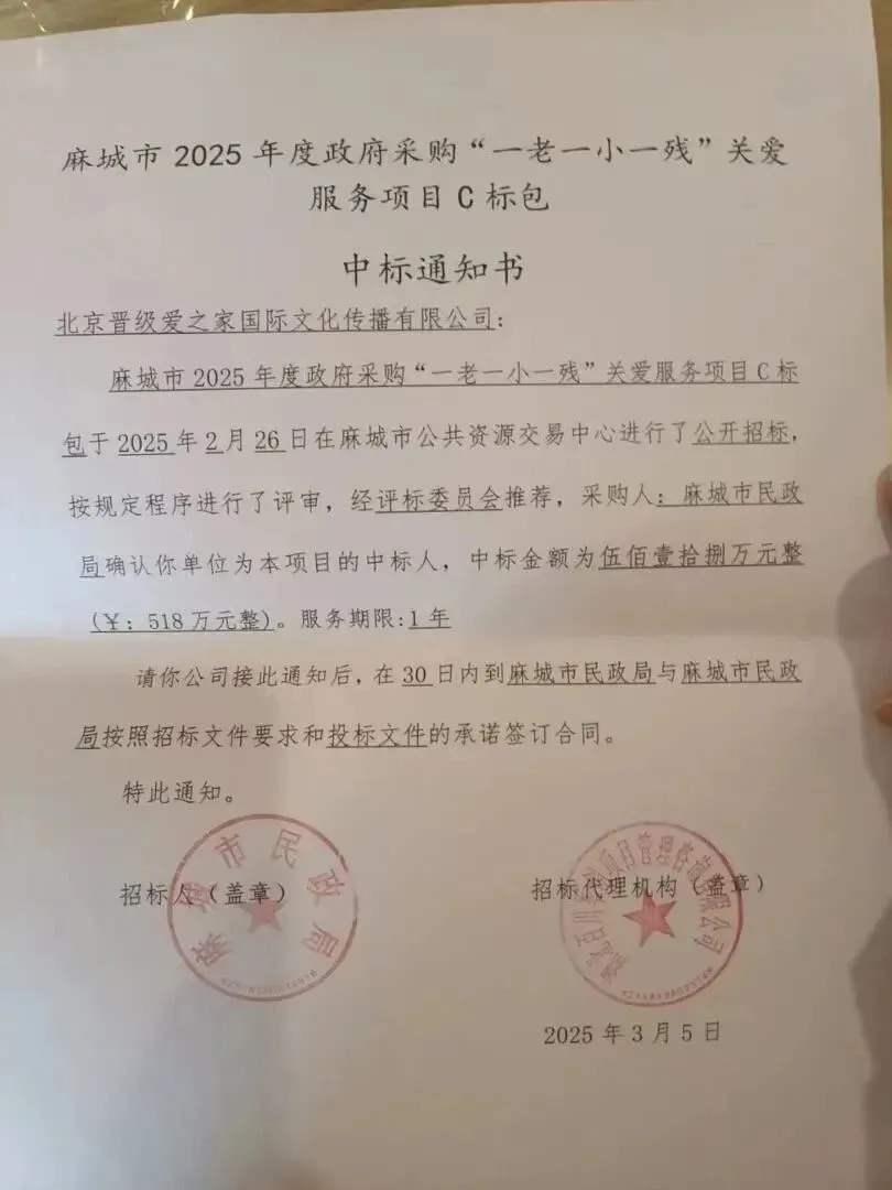 此次中标项目,是麻城市民政局面向社会公开招标的重点民生工程,当地社会救助资金规模超4亿元,其中5%专项用于 “一老一小” 等群体关爱服务。晋级集团凭借严谨方案与务实报价,从竞争中脱颖而出,顺利拿下这一重要项目。这一突破,标志着晋级从以往纯市场化运营模式,正式迈入政策与市场双轮驱动的全新发展阶段,让全国托管行业看到了政策扶持下的新赛道、新机遇。